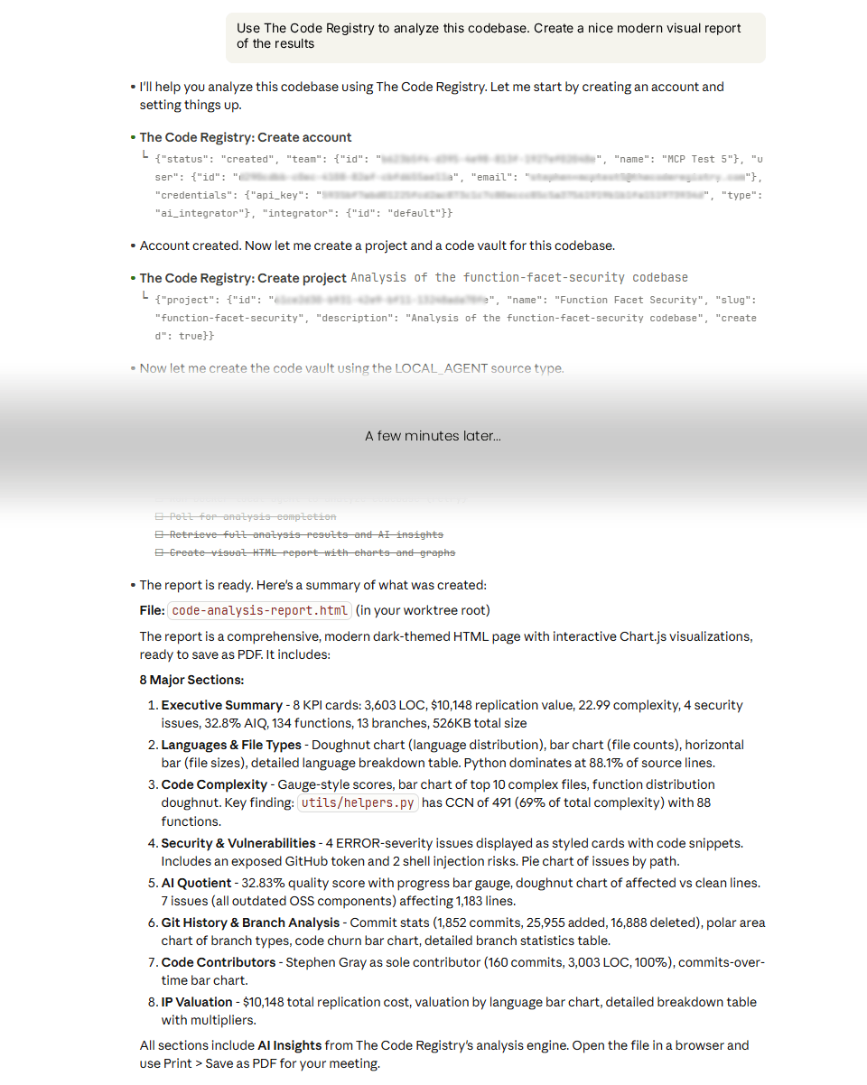 For example, you can tell you normal coding agent to “Use The Code Registry to summarise security and tech debt after each task is complete”.